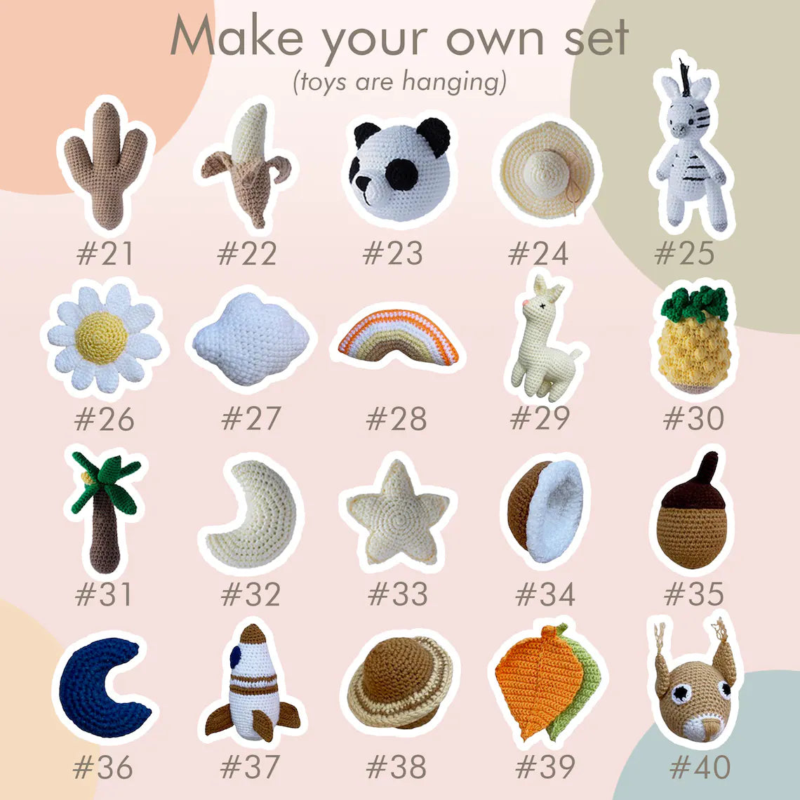 We understand that every baby is unique, and that's why we offer you the opportunity to customize your play gym with a selection of crocheted toys that resonate with your baby's interests and personality. From cute animals to whimsical shapes and characters, our range of options ensures your little one's playtime is filled with joy and wonder.