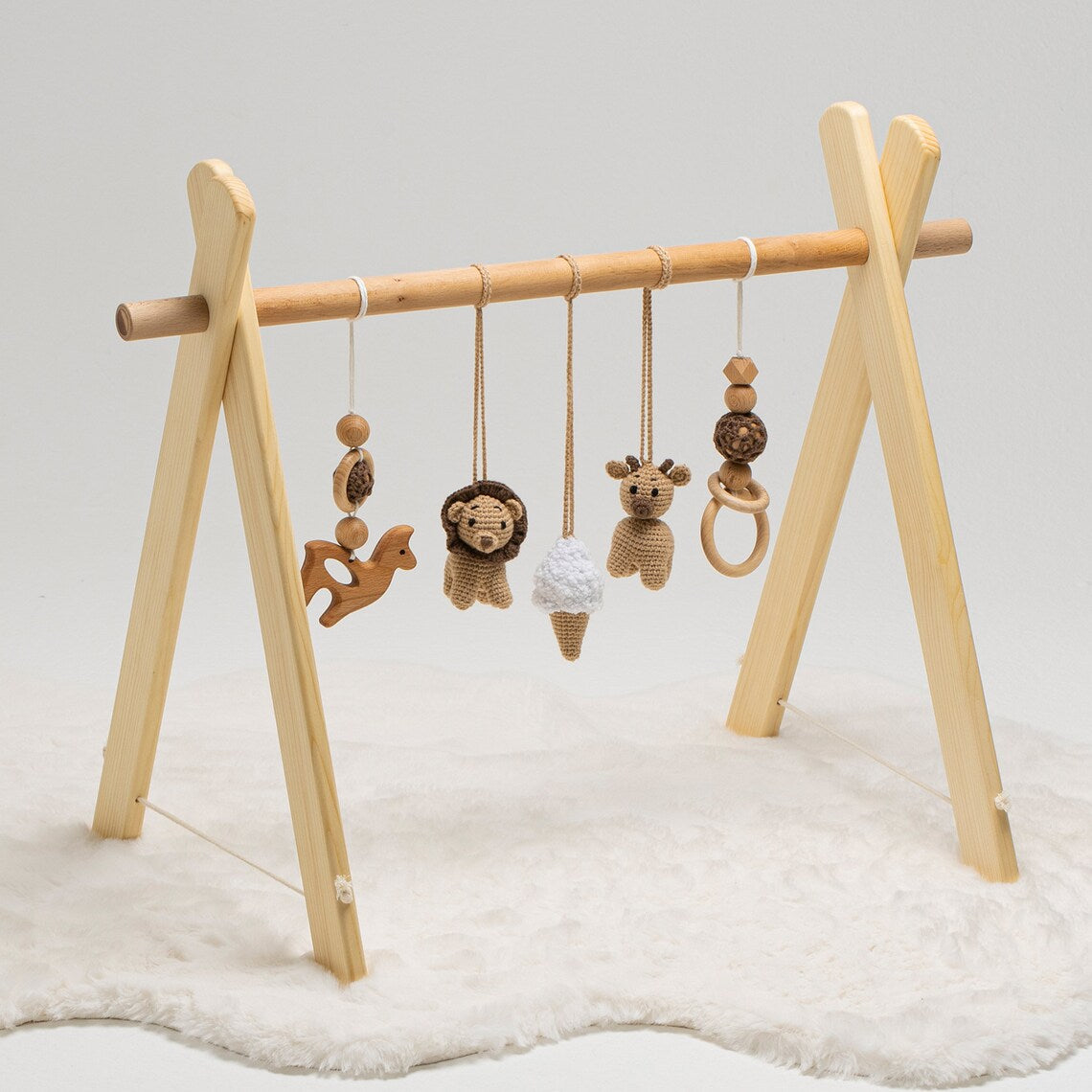 What sets our play gym apart is the collection of handmade crocheted toys that dangle from the overhead frame. These soft and colorful toys are not only visually appealing but also offer tactile and sensory experiences. Each toy is lovingly crafted by skilled artisans, ensuring both quality and safety for your baby.