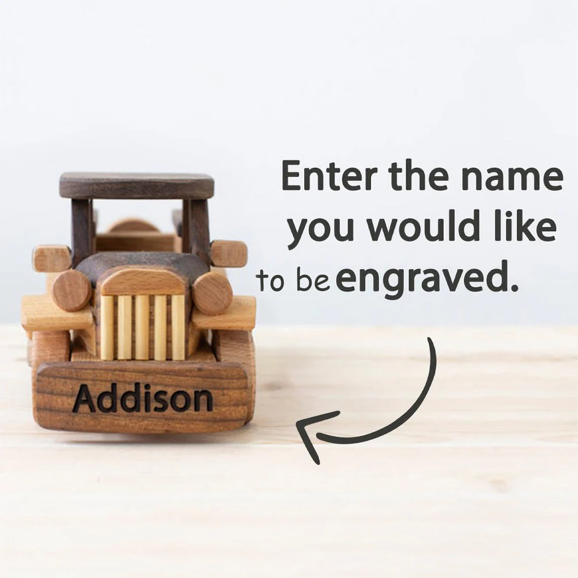 We can personalize it by engraving your kid's name on the toy (you can also request customization)