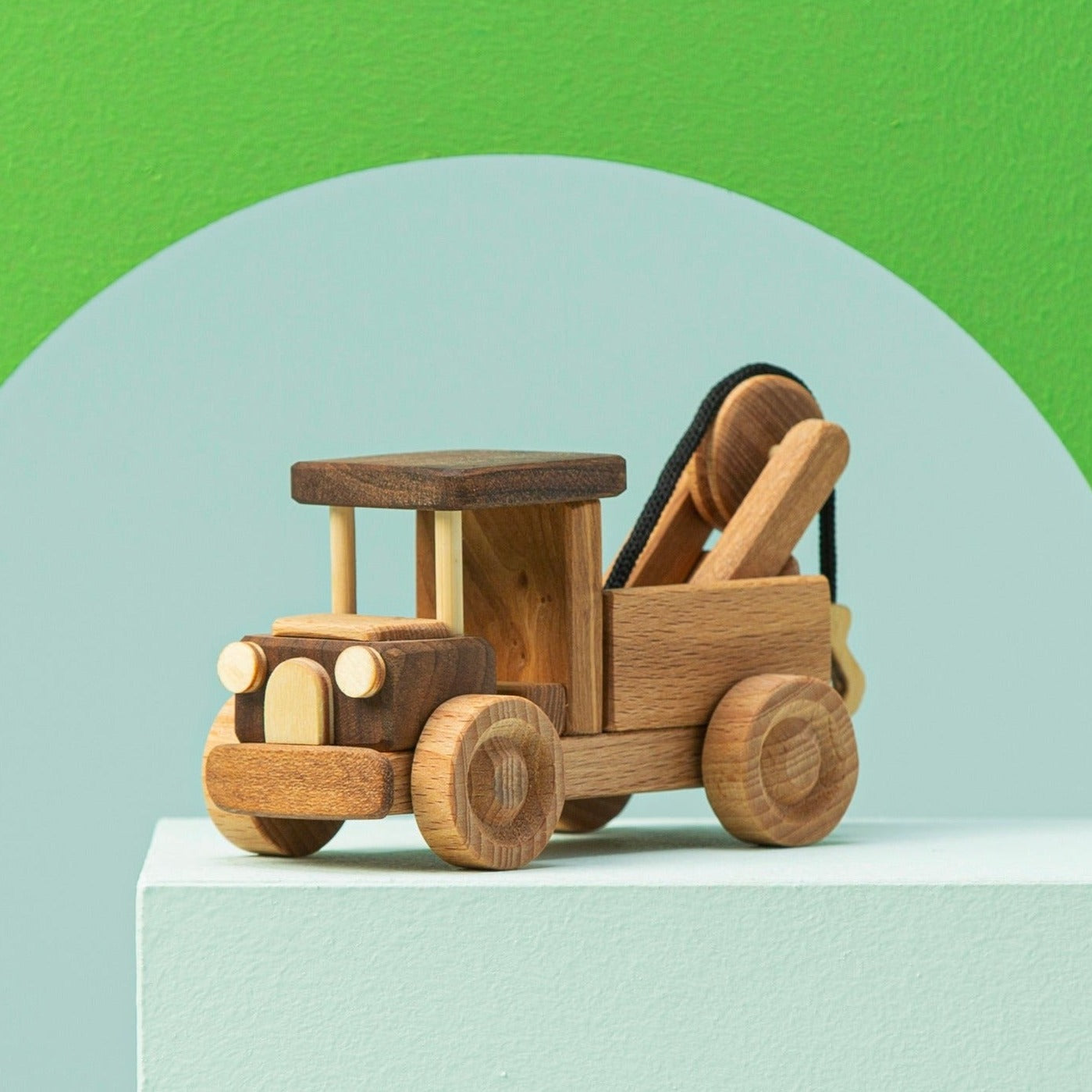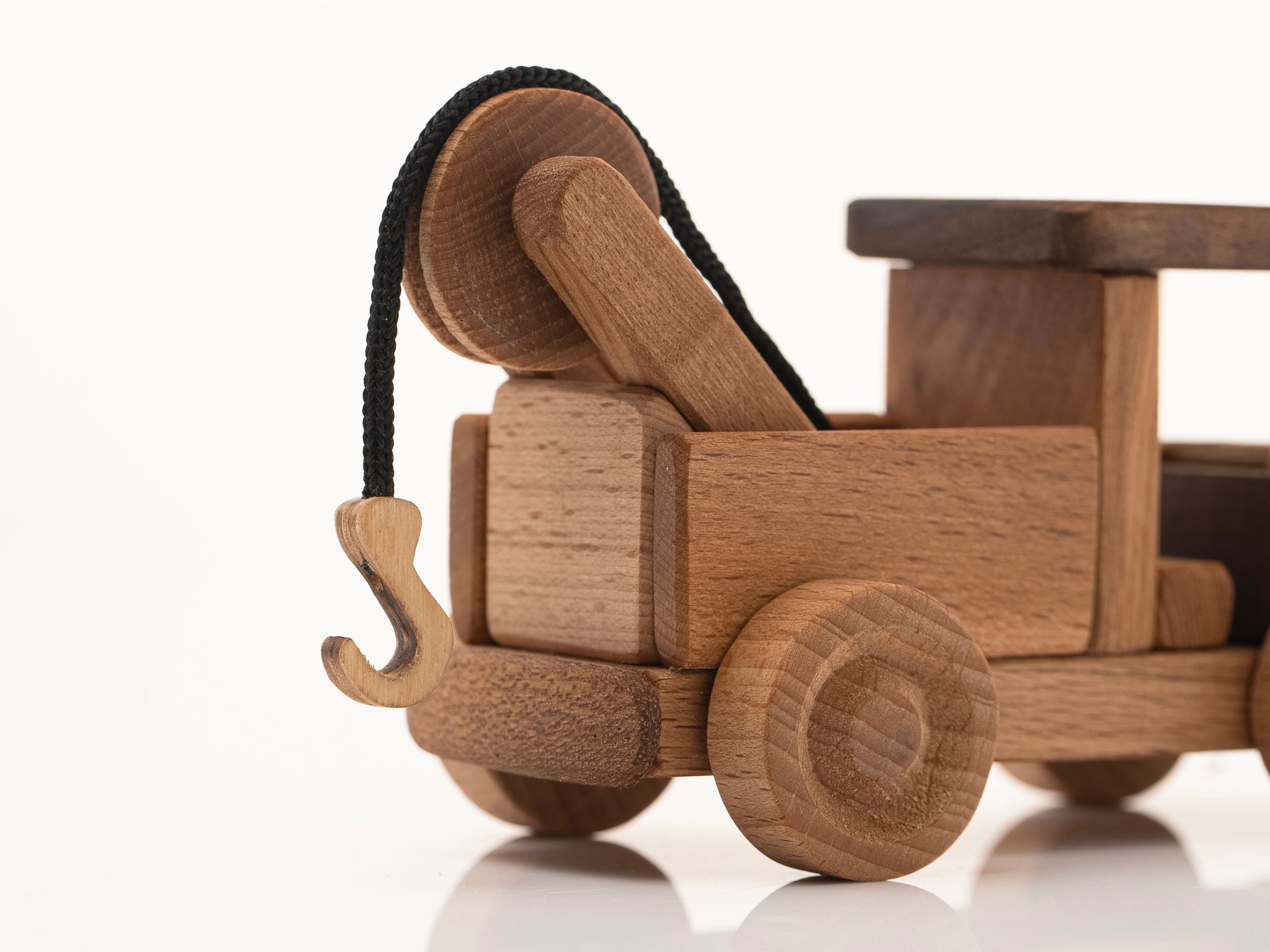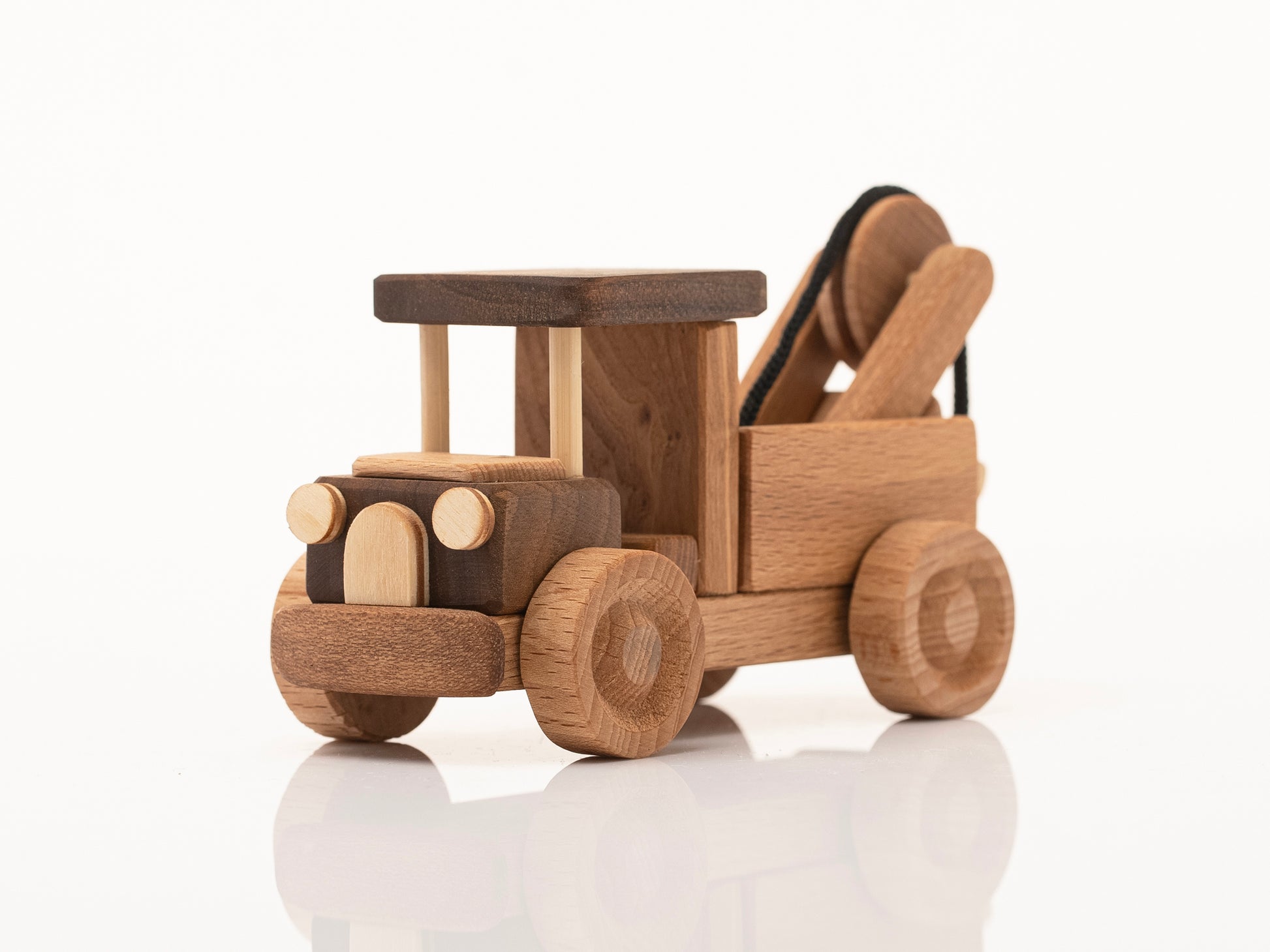 Spark your child’s imagination with this sturdy wooden toy tow truck. All children will love to play construction with this solid wood tow truck. The hinged back allows for true play. This unpainted mini tow truck is durable to last through the generations. Personalize it with your child’s name engraved across the front to make it extra special. It is finished with walnut oil and has a smooth surface, safe for all ages.