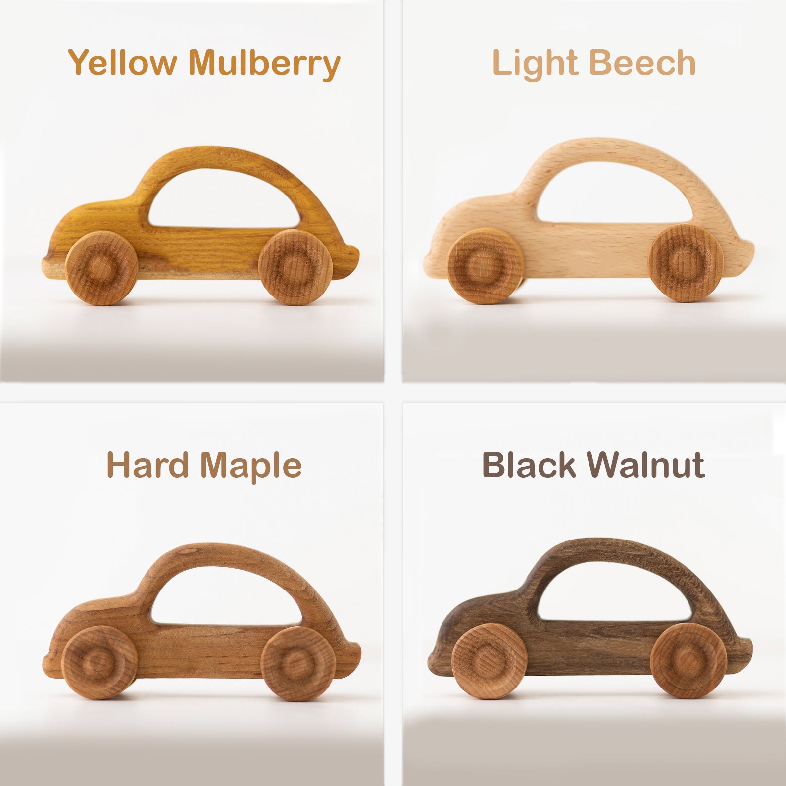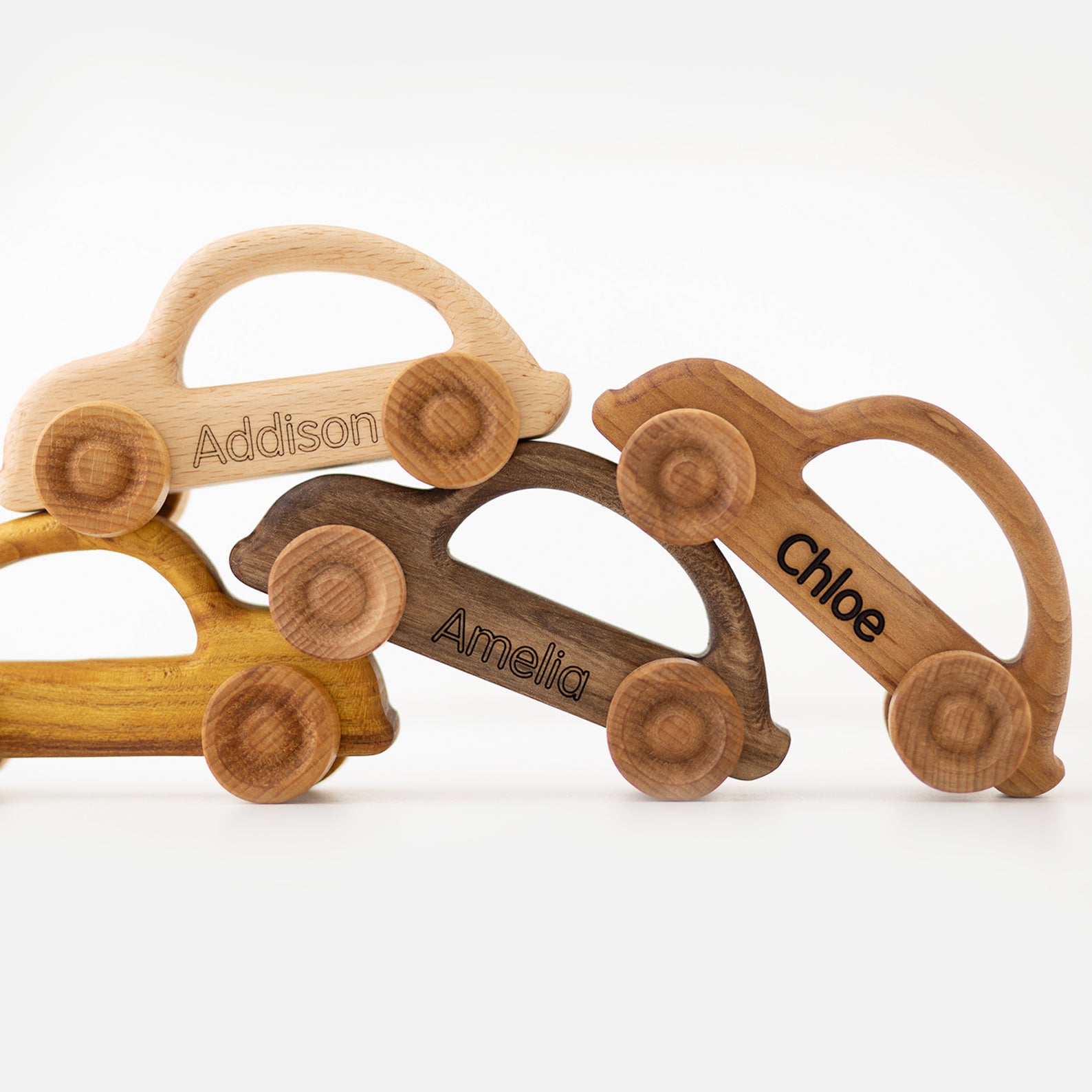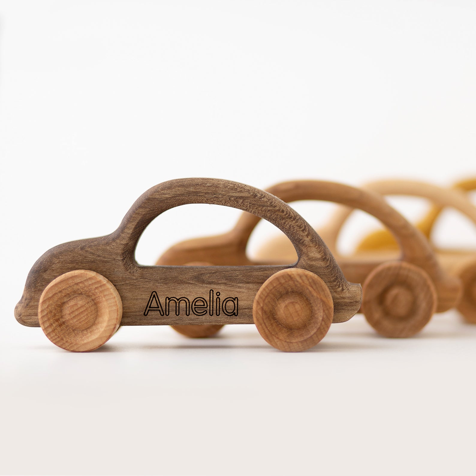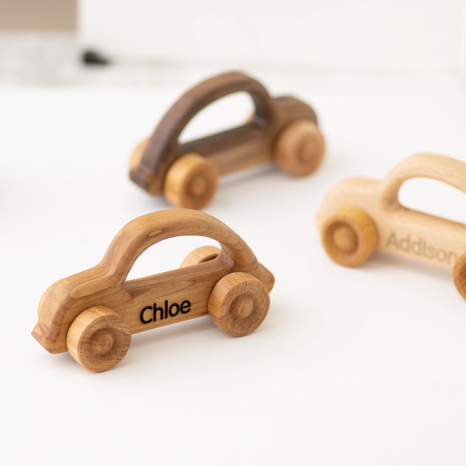 Wooden Mini Car - Personalized Wooden Toys - Push Toy, vintage style wood mini car makes a great classic toy for both girls and boys. It is handmade of safe natural materials and finished with walnut oil. The surface is smooth and won’t harm your children. It’s perfect for all ages and makes a wonderful gift. We can personalize it by engraving your child’s name across the toy. This environmentally safe toy is durable to last through the generations.