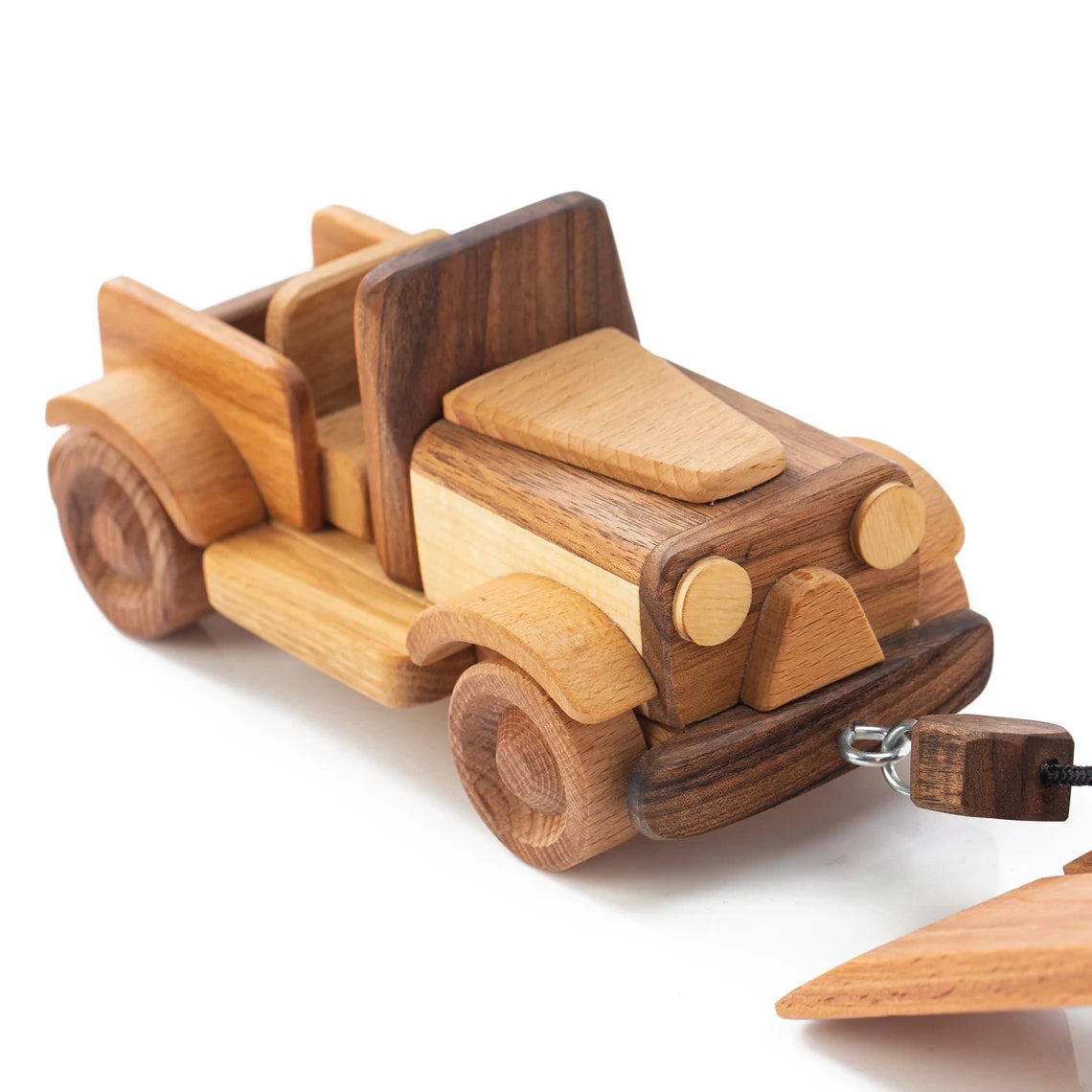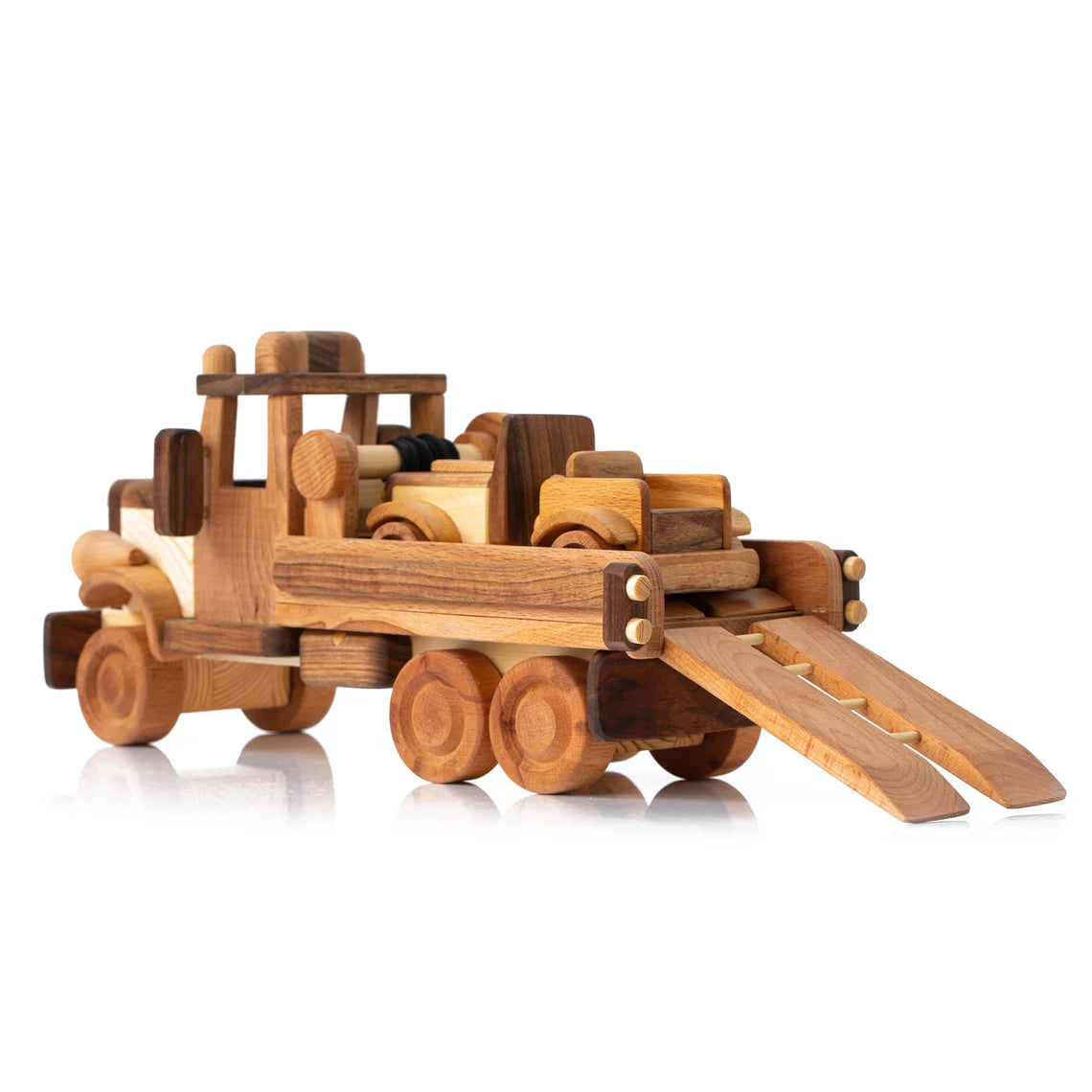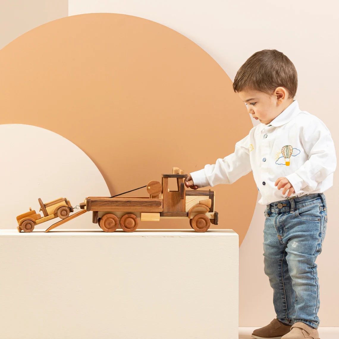 Meticulously handcrafted from premium, sustainably sourced wood, this tow truck set exemplifies our dedication to preserving the environment. The use of non-toxic, water-based paints ensures that the toys are safe for children while remaining gentle on the planet. Each piece is thoughtfully designed for durability, ensuring countless hours of playtime enjoyment.