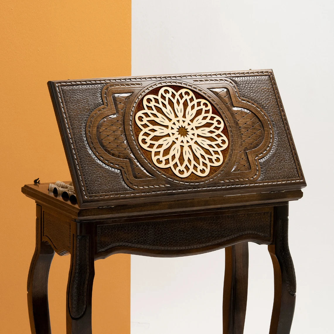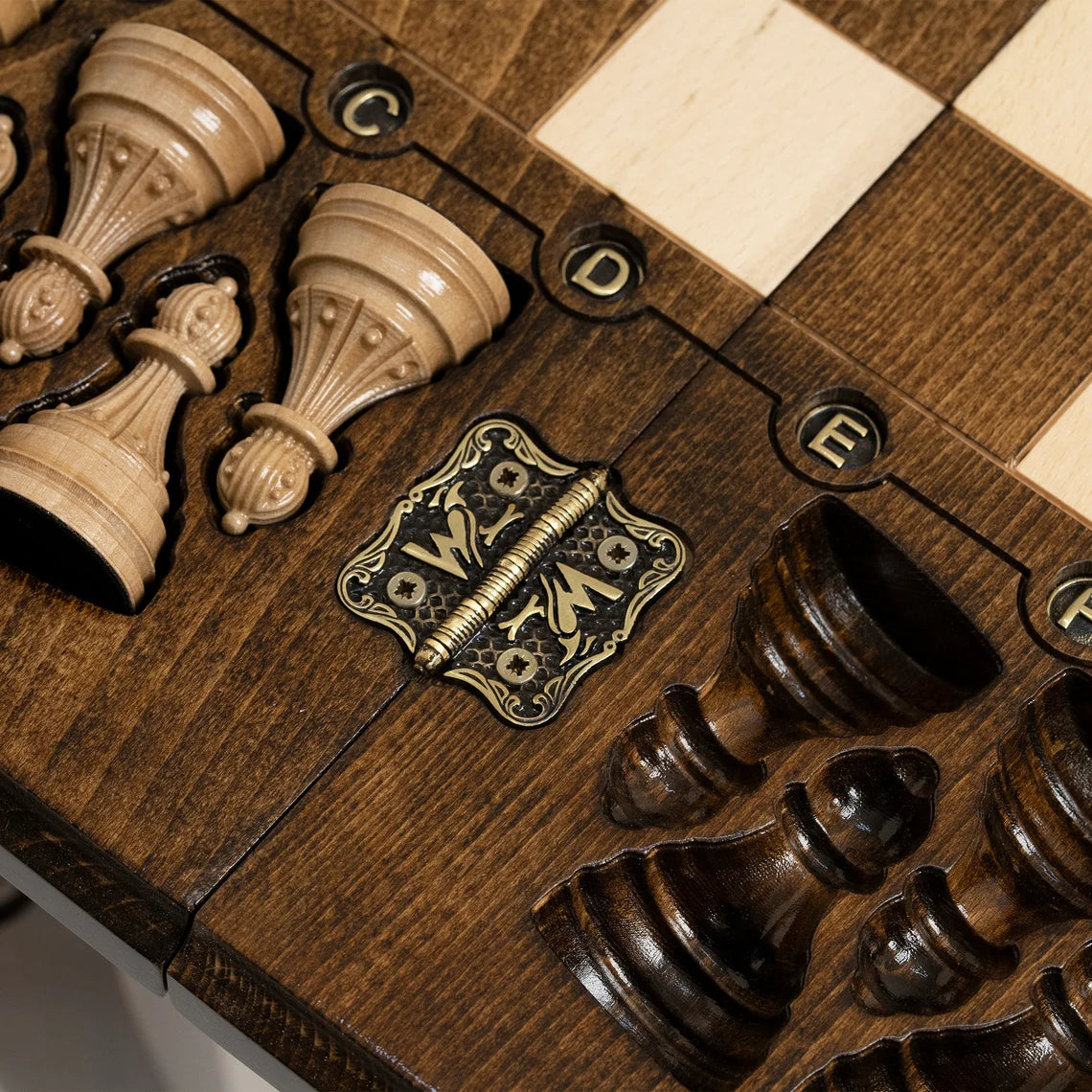 The tabletop is adorned with exquisite, intricate engraved ornaments that add a touch of sophistication to your chess matches. These ornaments are carefully carved into the wood, creating a stunning visual focal point that makes this table truly one-of-a-kind.