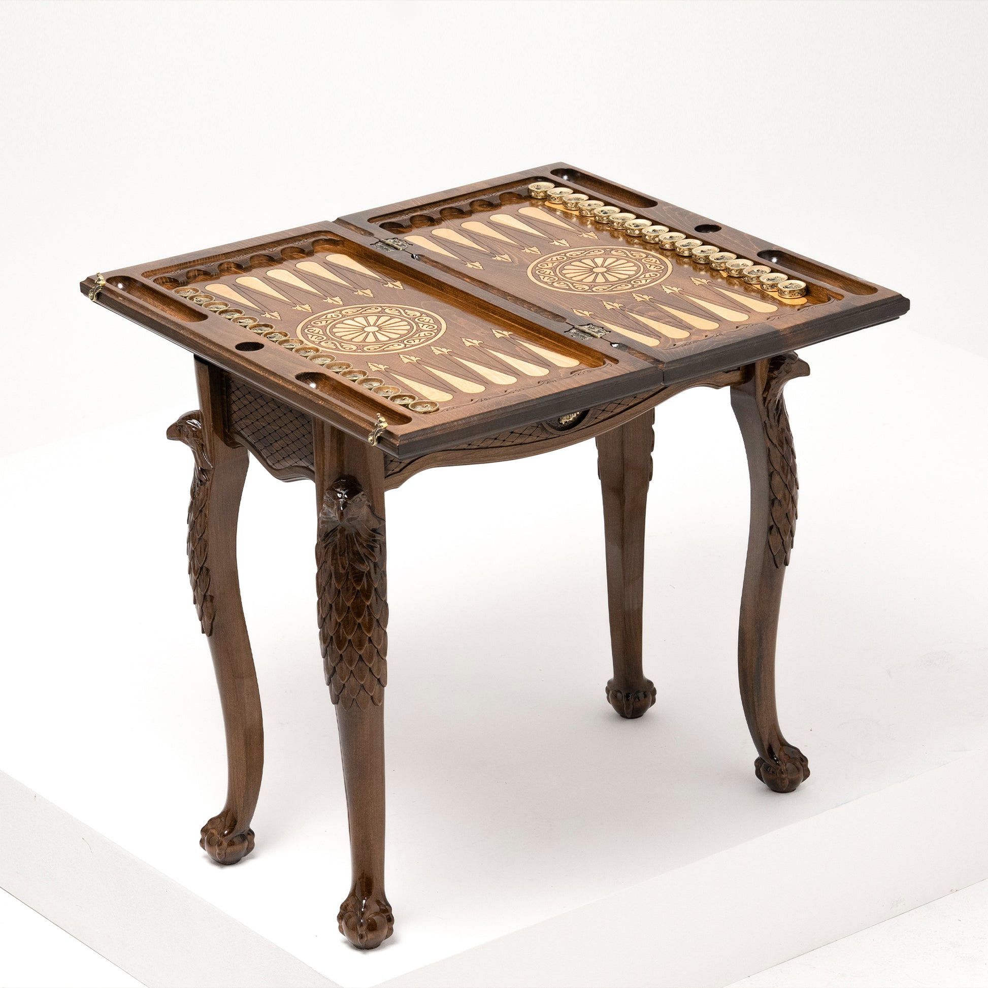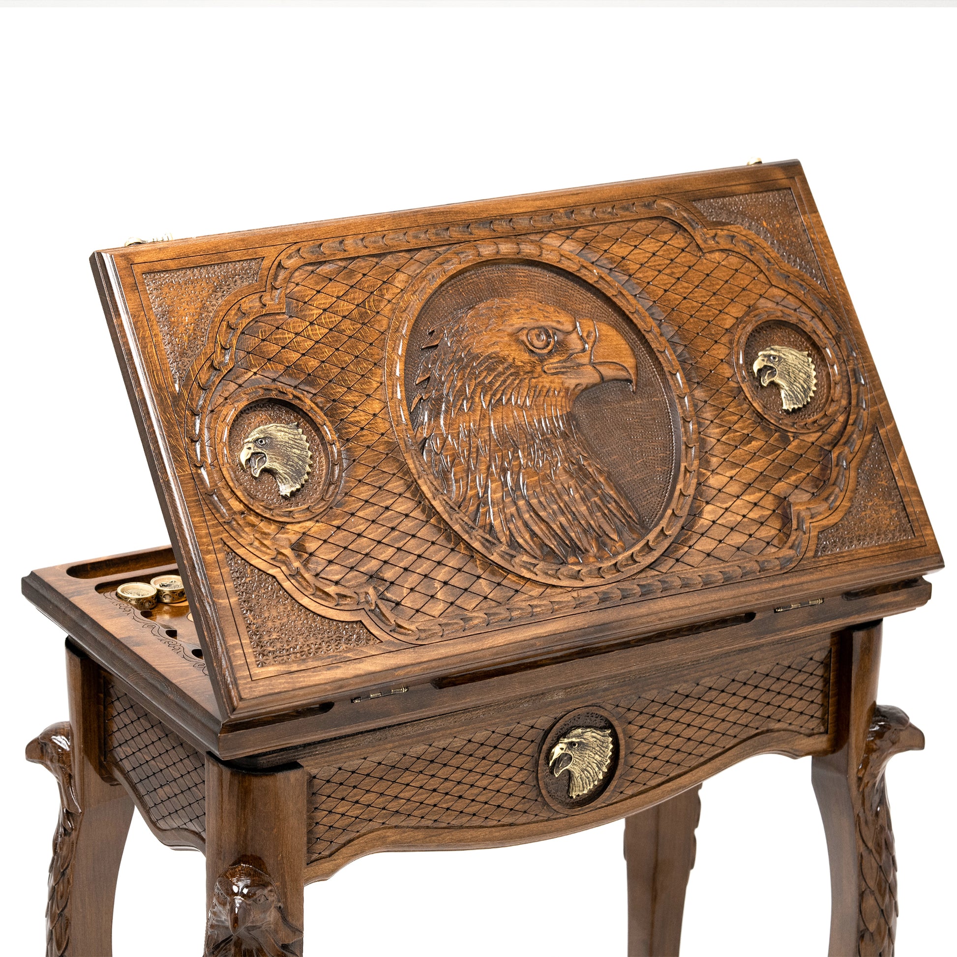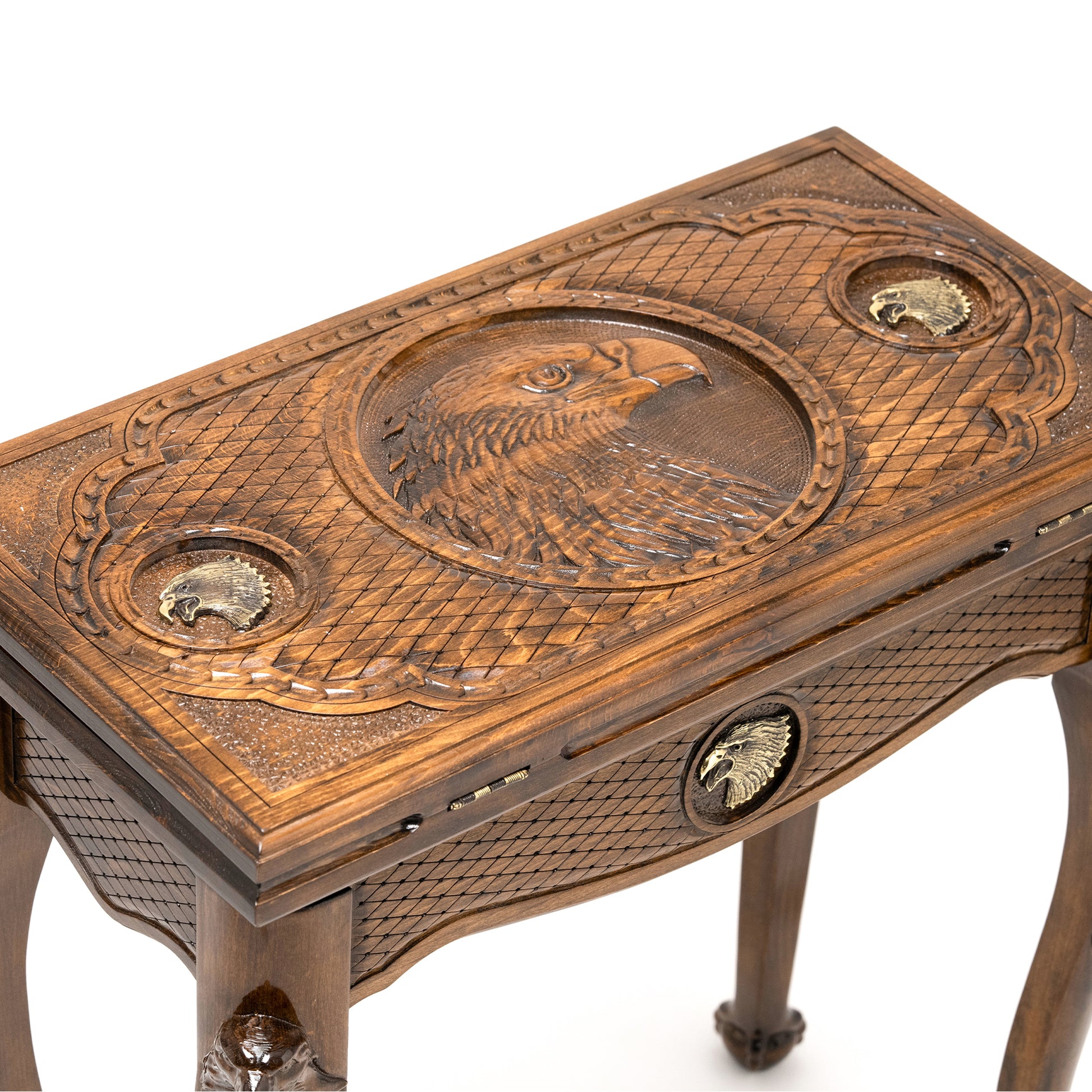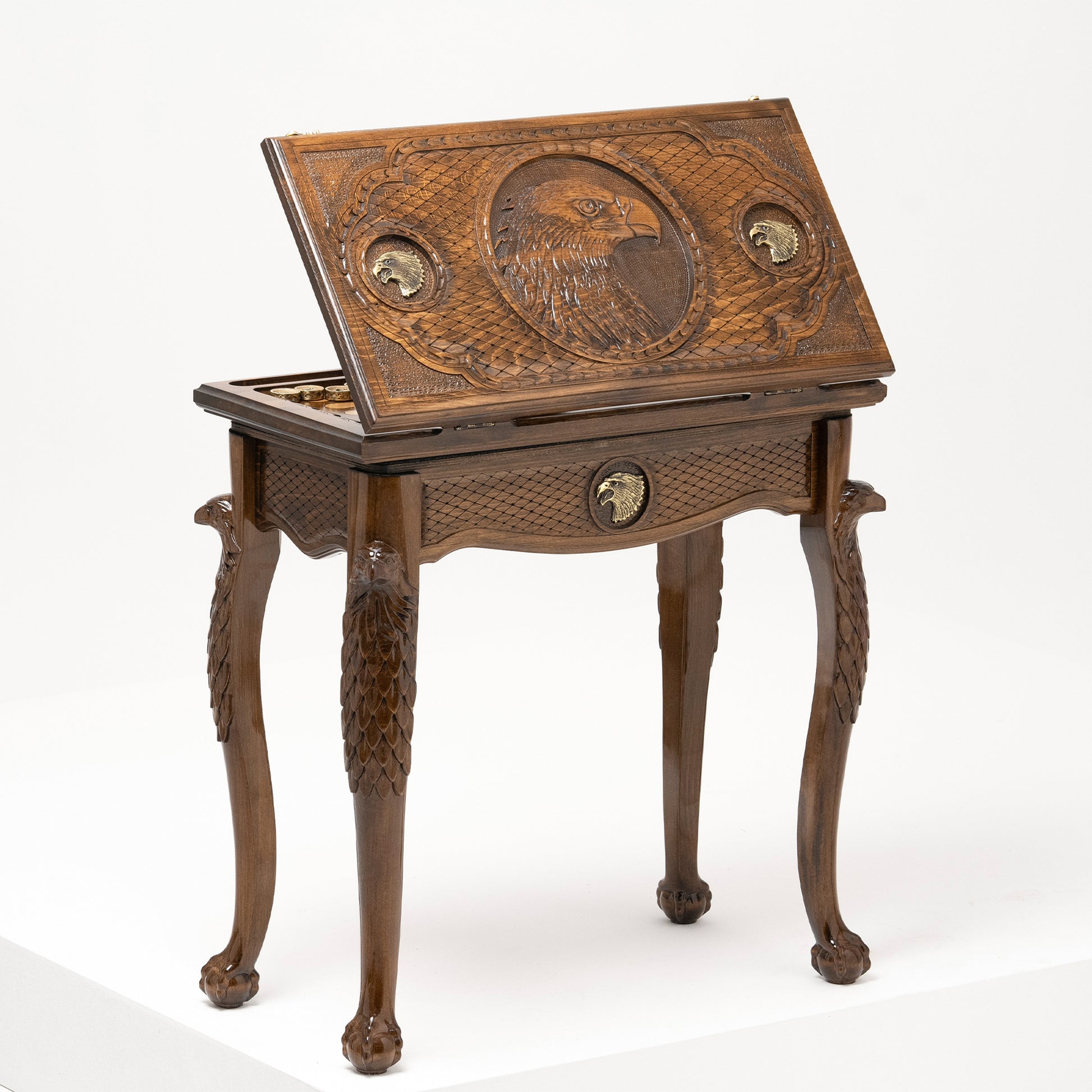 Whether you are a seasoned backgammon enthusiast or someone who appreciates fine craftsmanship, this wooden handmade backgammon table with Eagle bronze details is a statement piece that brings together traditional artistry and modern convenience. Immerse yourself in the world of strategic gaming with a touch of luxury and style that only this unique table can provide.