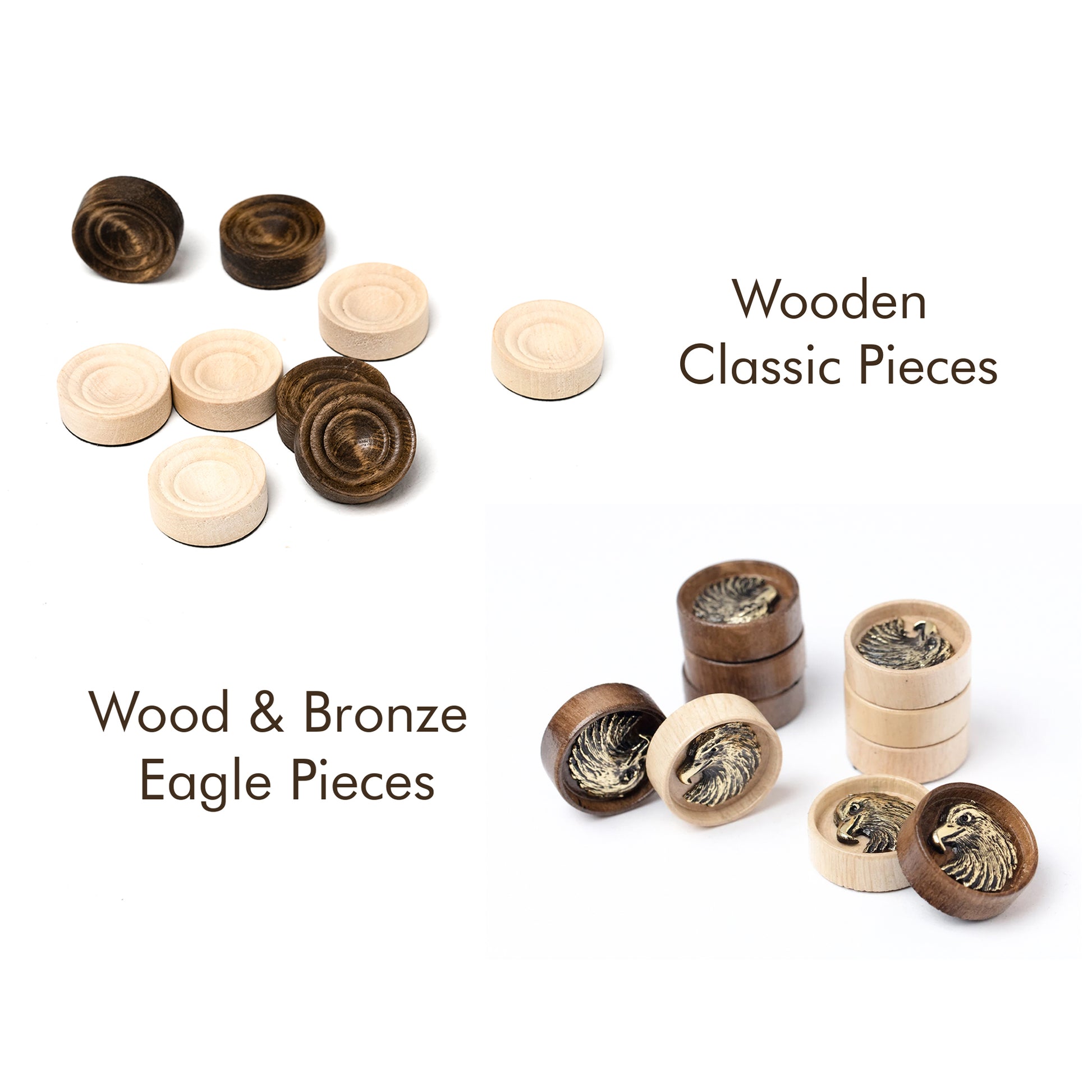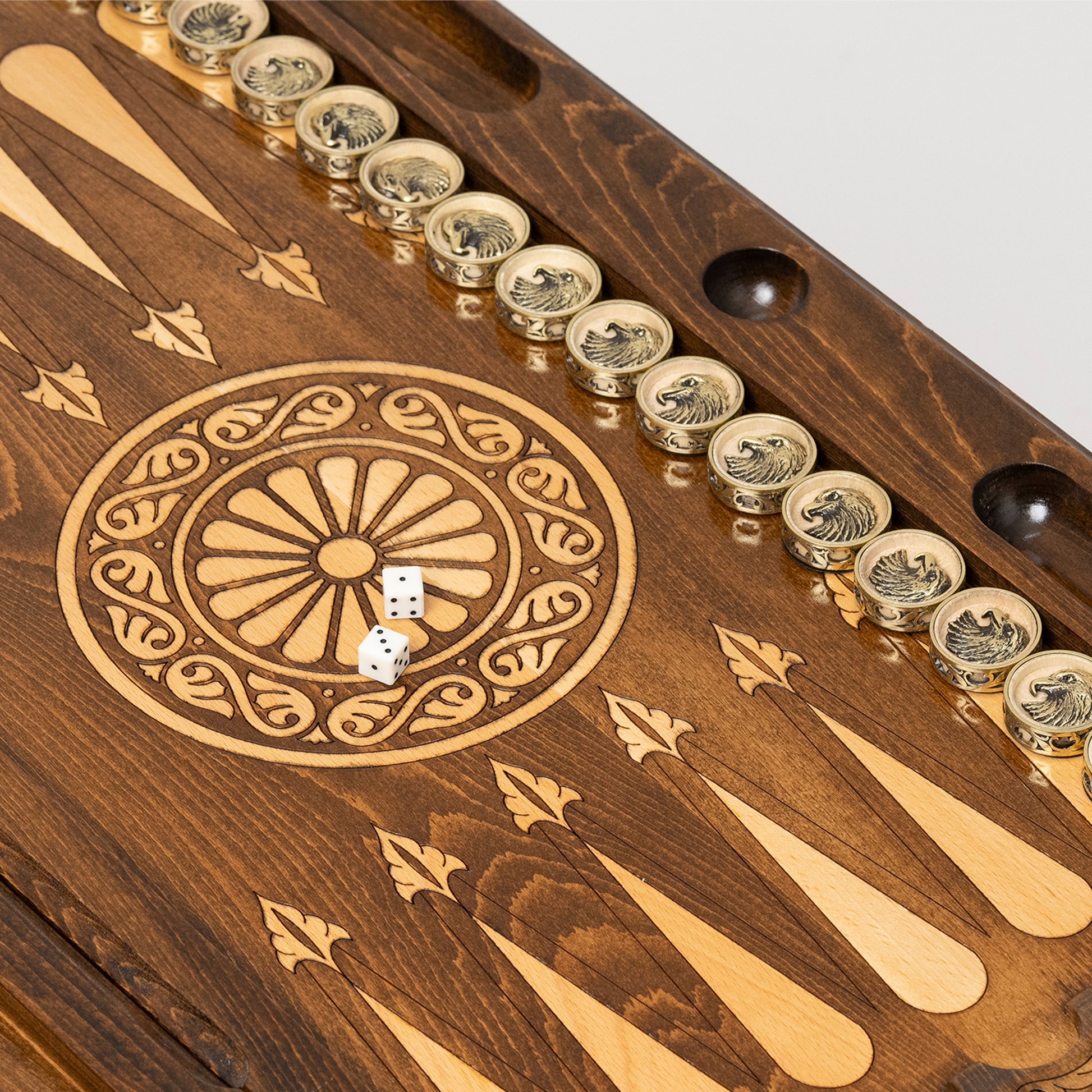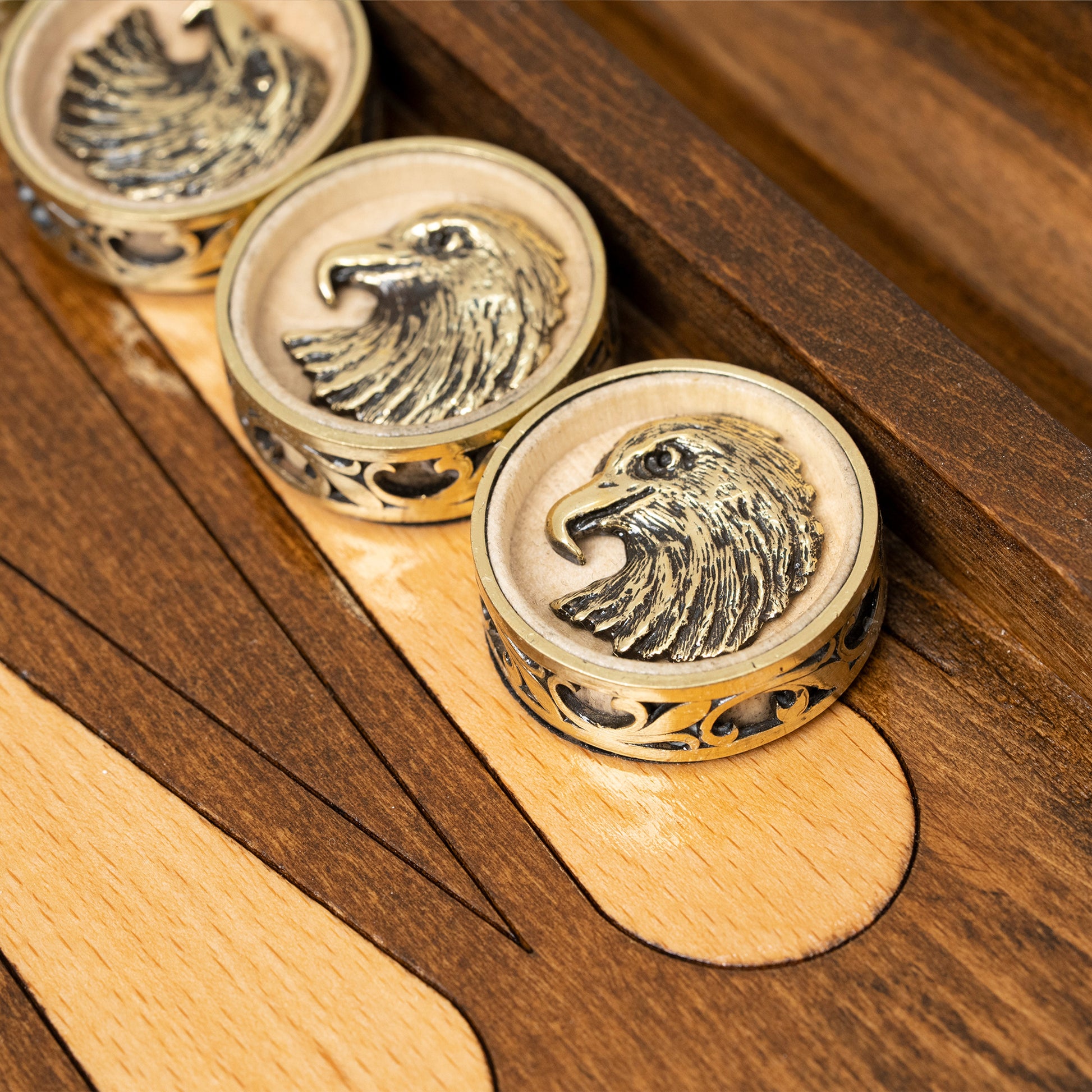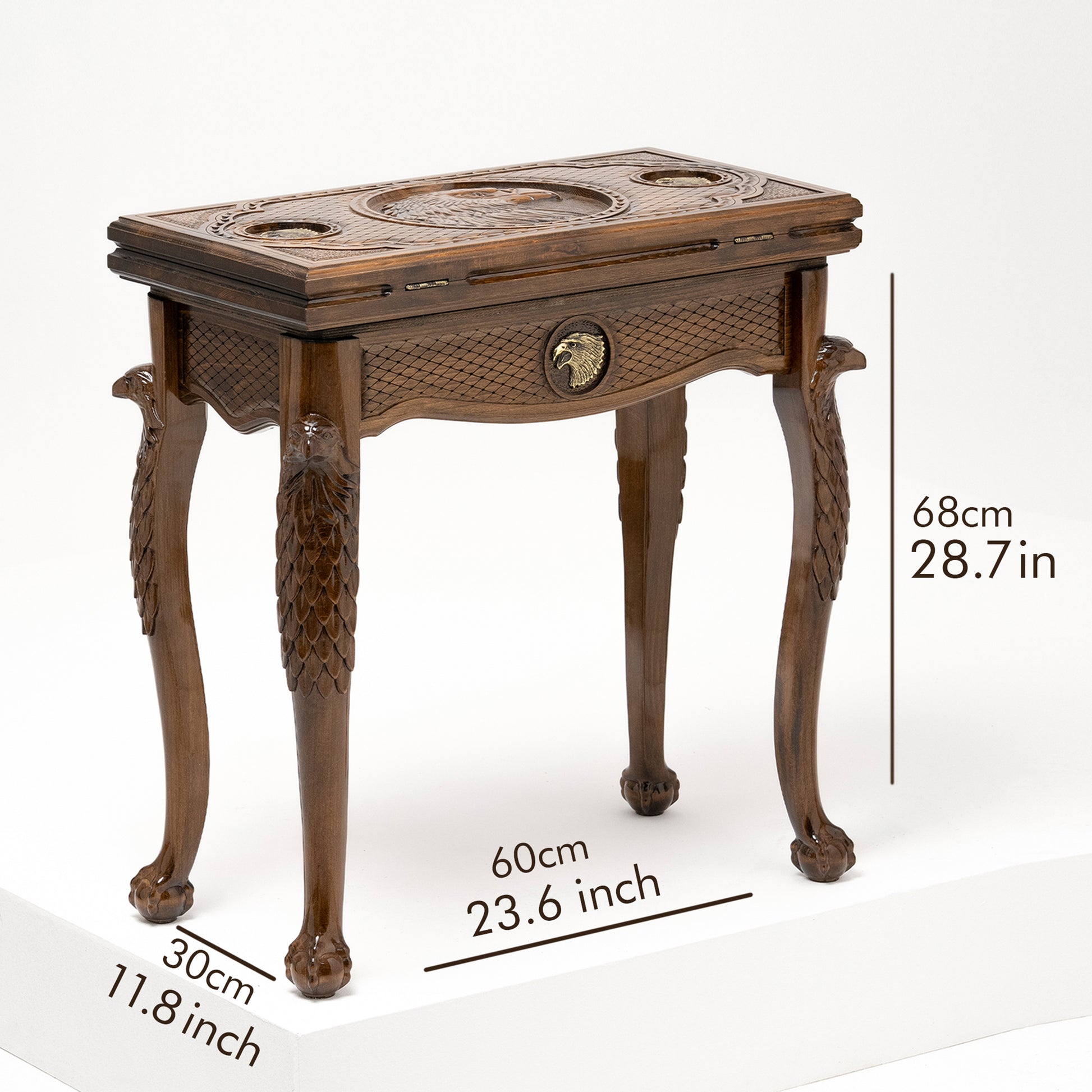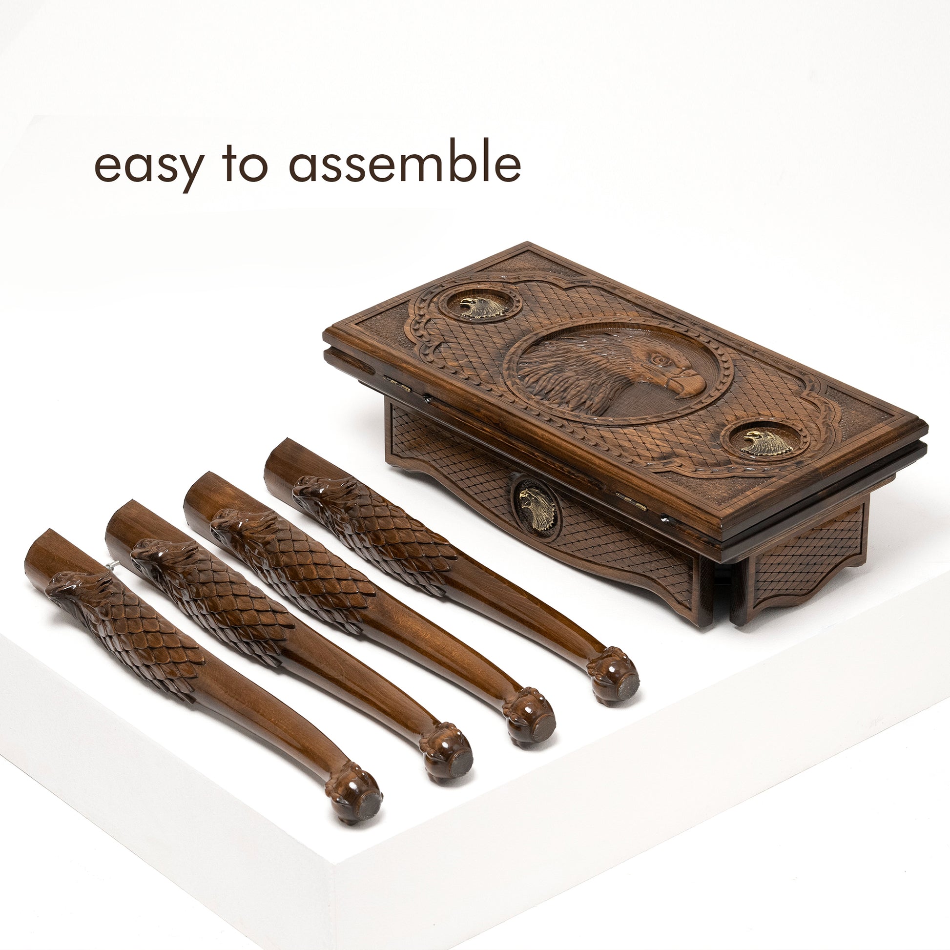 Whether you are a seasoned backgammon enthusiast or someone who appreciates fine craftsmanship, this wooden handmade backgammon table with Eagle bronze details is a statement piece that brings together traditional artistry and modern convenience. Immerse yourself in the world of strategic gaming with a touch of luxury and style that only this unique table can provide.
